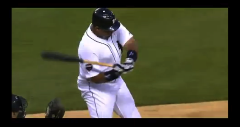 Consider Cabrera’s lower body as the key ingredient in keeping the barrel in the bat plane. The distance his back knee travels allows him to keep his barrel in the bat plane, and in this case, past his ideal point of contact. If Cabrera “squishes the bug”, he either rolls over or his barrel is out of the bat plane by the time the ball reaches him. There are other factors that help Cabrera stay in plane, such as elbow extension. However, if we want optimal power, we do not want to have elbow extension to occur before contact. Cabrera’s ability to keep the barrel in the bat plane past the point of contact is what makes him a cut above most major leaguers and the reason he won a Triple Crown. On the flip side, if Cabrera were to be late with his timing, his barrel in this particular swing is in plane starting at the back of the plate; giving him an opportunity to be successful.