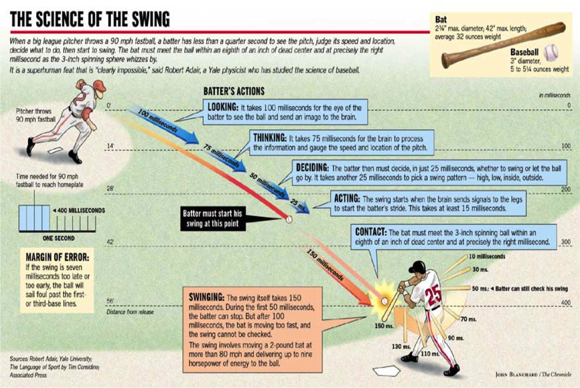 Professor Adair’s study does not include human variability. At any time, the pitcher can change his delivery and pitch velocity, which affects the timing aspect of the hitter. Professor Adair’s statistics are of one pitch! Each pitch thrown by a pitcher in a game is unique! It almost seems humanly impossible to be on time consistently. I can guarantee that the best hitters in the game aren’t always on time, yet they still manage to eclipse the .300 average mark. Hitting a baseball now becomes an equation of probability. After all, pitch recognition is a guess! It has been said that hitters lose track of the baseball within 5 feet of the plate….. so now what? Hitting a baseball now becomes an educated guess! You are starting your swing where you THINK the ball will be.
